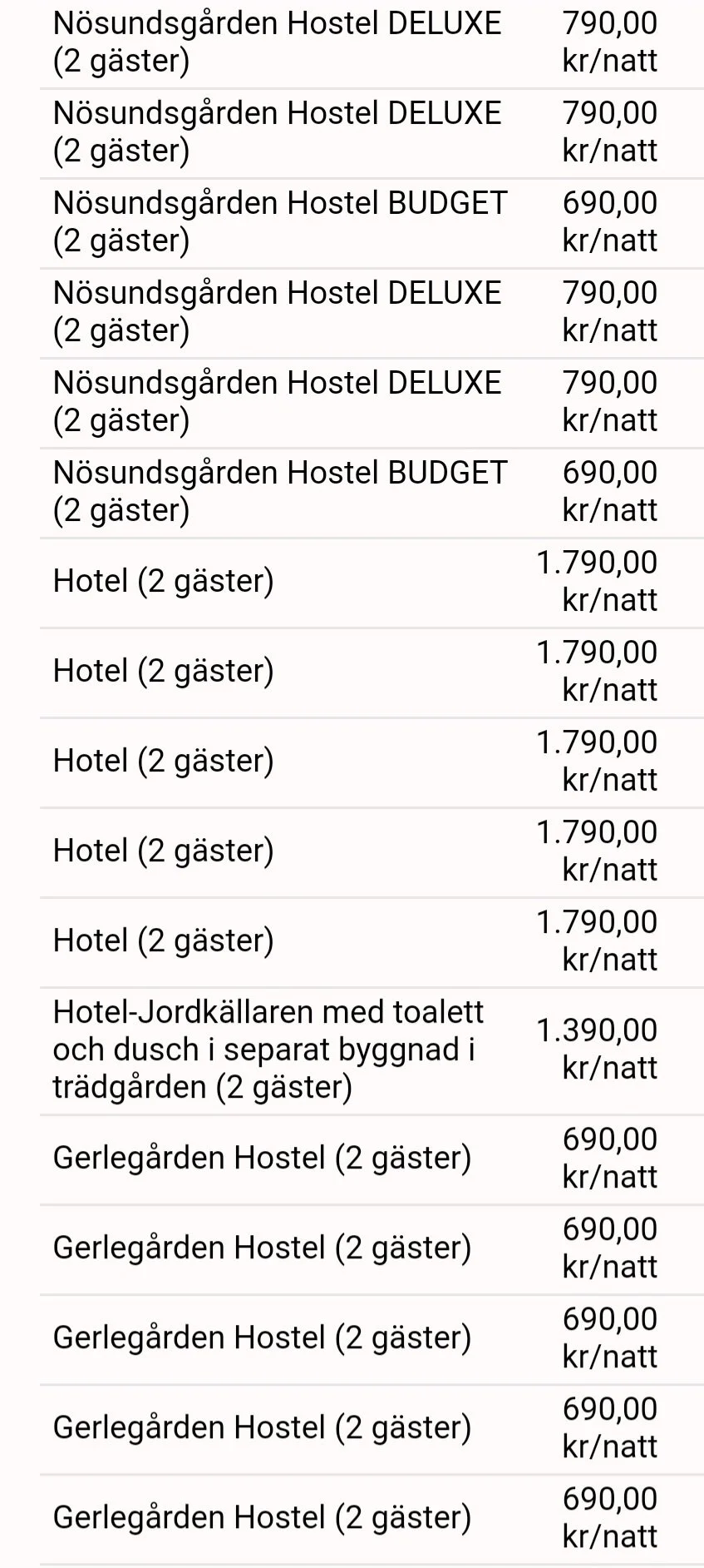 690 - 1790 kr/natt per rum (för två personer). Vid behov kan man sätta in en extrasäng i rummen för en mindre summa.